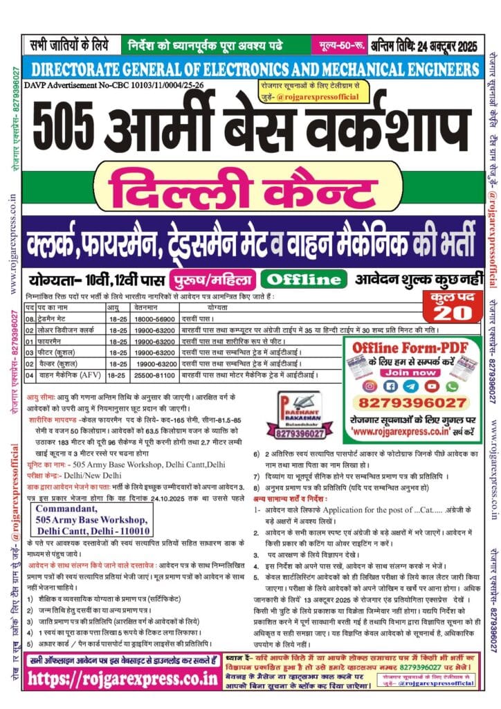 Category: 10th Pass, 12th Pass, All India Jobs, Army EME, Defence, Defence Jobs, Latest Jobs, Offline Forms